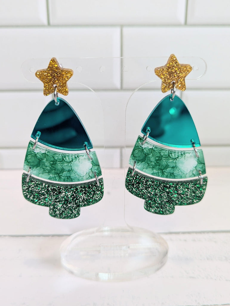 3mm printed clear acrylic with cut green mirror and green glitter acrylic, with star toppers.